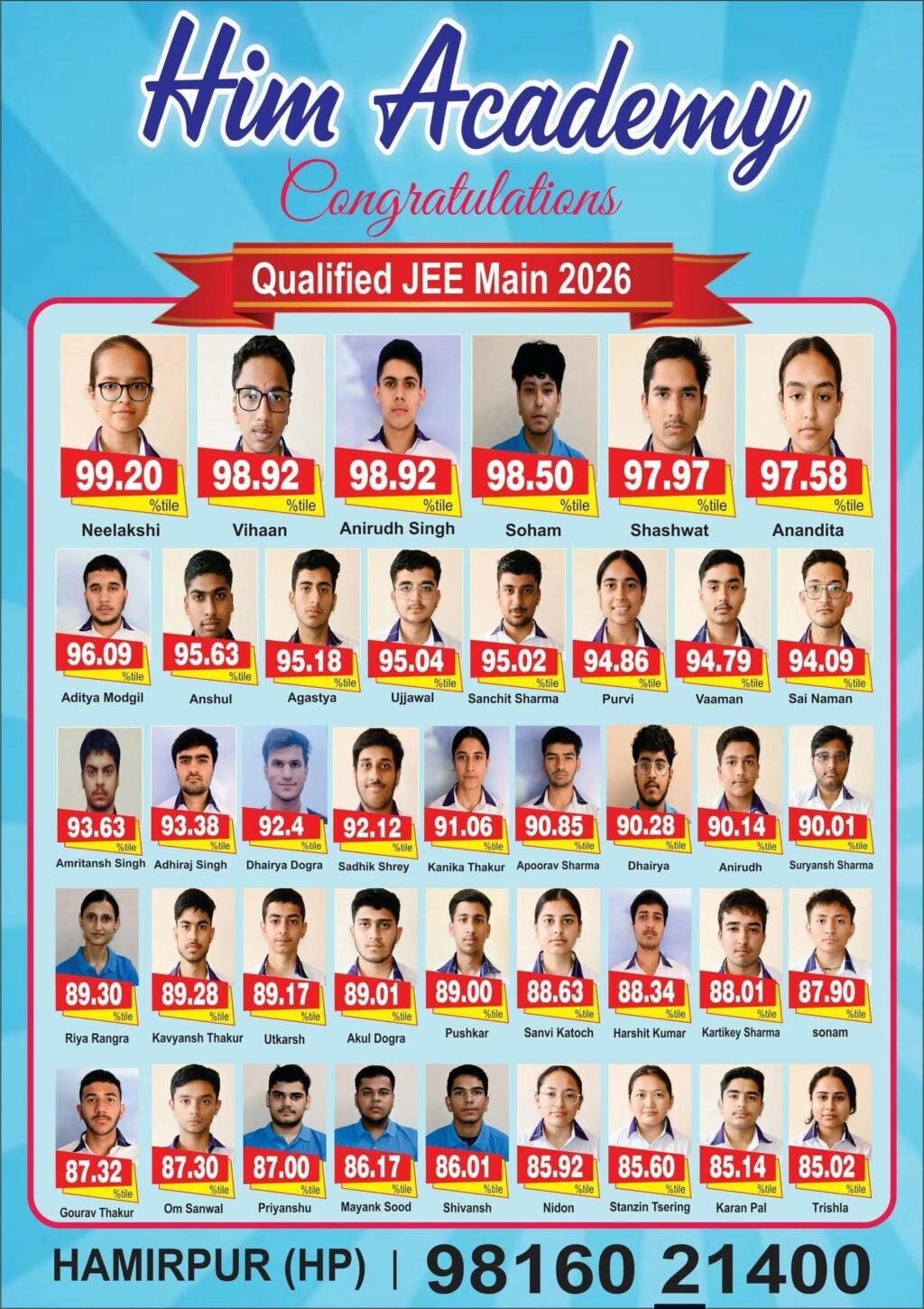 हमीरपुर। सतीश शर्मा विट्टू। देवभूमि हिमाचल प्रदेश में शिक्षा के क्षेत्र में इतिहास रच रही हिम अकादमी के बच्चों ने लगातार इस साल भी जेईई मेन परीक्षा में शानदार सफलता प्राप्त की है हमीरपुर जिला में स्थापित शिक्षण संस्थान का इतिहास रहा है कि शानदार परीक्षा परिणाम देकर इस संस्थान ने शानदार उपलब्धियां प्राप्त की हैं इसी वर्ष जेईई मेन परीक्षा में 40 से अधिक बच्चों ने शानदार सफलता प्राप्त की है इस शानदार उपलब्धि के लिए संस्था को कोटि-कोटि बधाई एवं शुभकामनाएं। प्रदेश भर के बच्चे इस शिक्षण संस्थान में शिक्षा लेकर बरसों से इतिहास रच रहे हैं इस साल भी इस स्कूल के बच्चों ने शानदार उपलब्धि हासिल की है। 20वीं शताब्दी में शुरू हुआ यह शिक्षण संस्थान हिमाचल प्रदेश में शिक्षा के क्षेत्र में आदर्श बनकर उभरा है तथा शिक्षा की गुणवत्ता के साथ हिमाचल प्रदेश के सैकड़ो युवाओं को रोजगार उपलब्ध करवाने में भी महत्वपूर्ण भूमिका अदा कर रहा है।